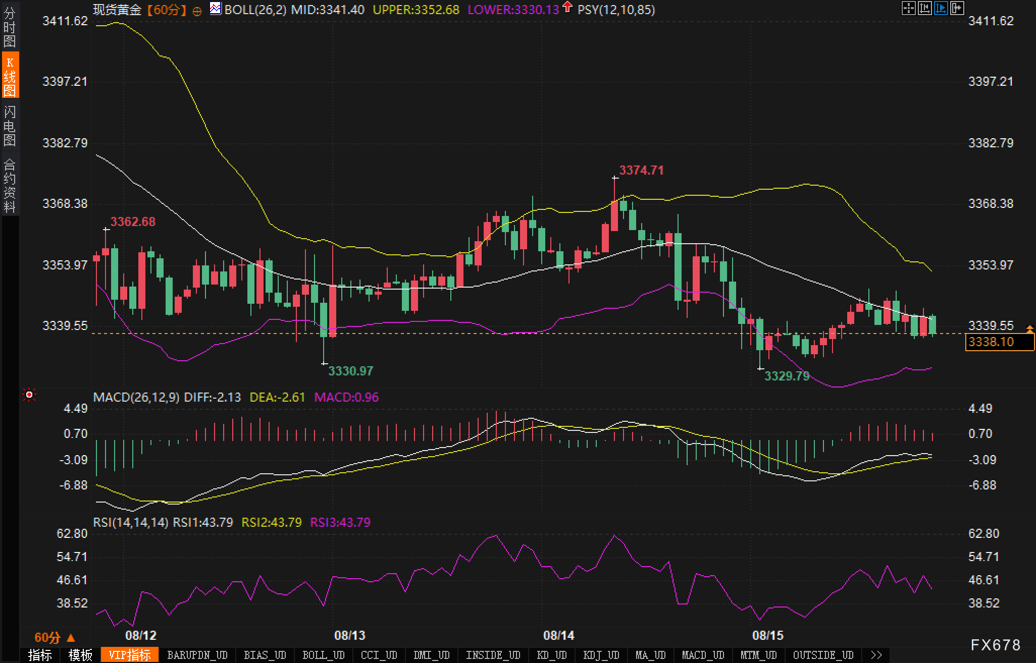 从60分钟K线观察,布林带(262)三轨参数分别为:中轨MID 3341.40,上轨UPPER 3352.68,下轨LOWER 3330.13。价格当前围绕3339—3341一线运行,反复在中轨下方与中轨附近拉锯,显示短线仍以“均值回归型”振荡为主,趋势强度有限。右侧价格多次尝试上探但未能有效站上上轨,3350—3353区域对应布林上轨与右侧密集成交带,形成第一阻力带;其上为8/14盘中高点3374.71与前期回落前的波峰3362.68,两者构成更高位的第二阻力带。支撑方面,布林下轨3330.13与8/15盘中低点3329.79基本重合,下方还有8/13一度快速刺破后的回抽低点3330.97,三者叠加为“强支撑簇”,若失守则意味着短线节奏从横盘转为下行扩散。