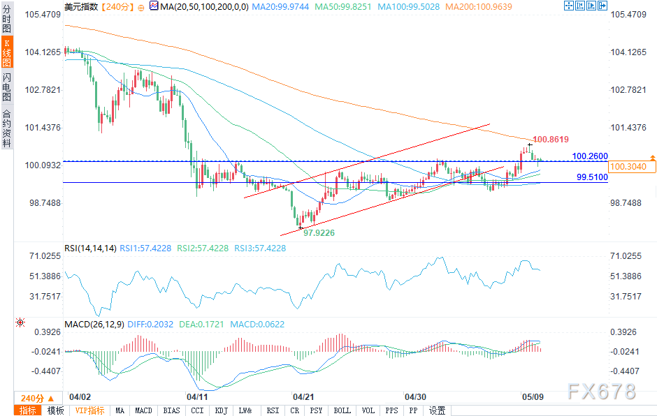如果美元指数收于100.20-100.40支撑位下方,将朝着50日移动均线99.81的方向运行。