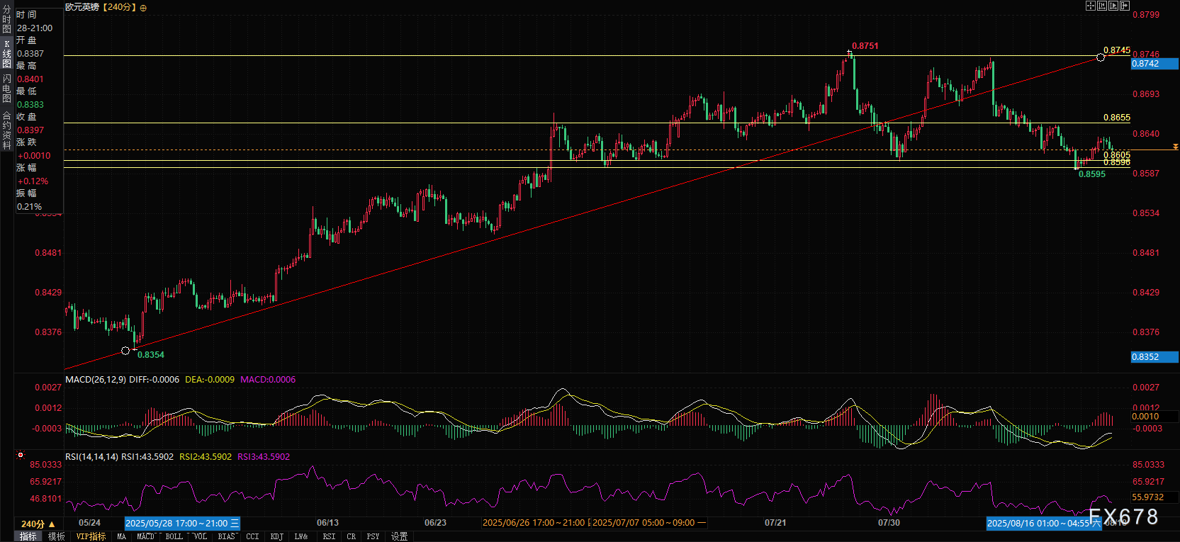 从4小时图来看,欧元兑英镑正下行测试0.8600-0.8610关键支撑区,该区域不仅是过去两个月的交易区间底部,更是8月25日与7月7日低点形成的双顶形态颈线位(此前顶部位于0.8740-0.8750区间)。