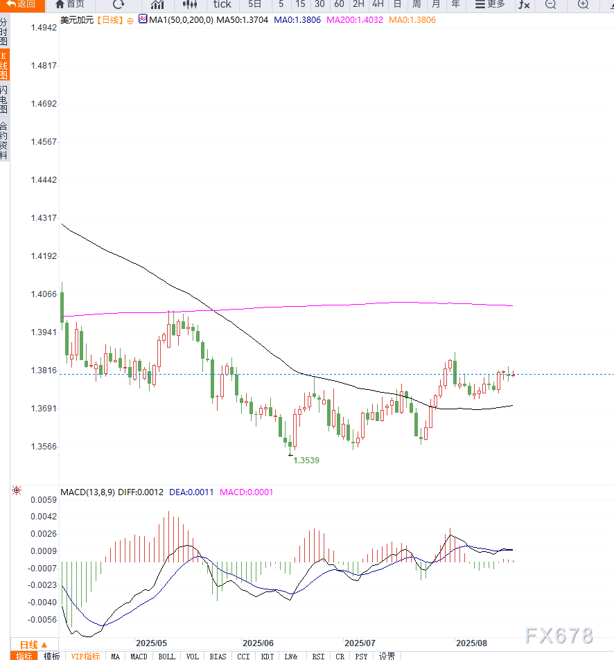 从美元兑加元日线图形来看,汇价在1.3750至1.3850区间内震荡整理,100日均线提供了下方支撑。若汇价突破1.3850并站稳,可能打开进一步上行空间指向1.3950;