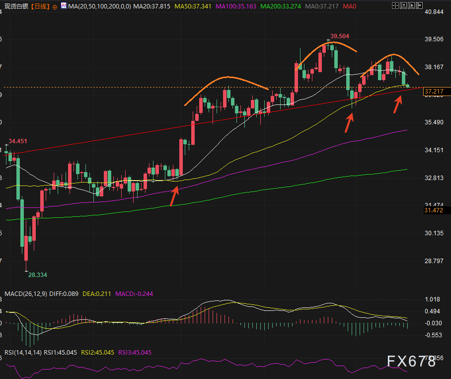 白银下探50日移动平均线