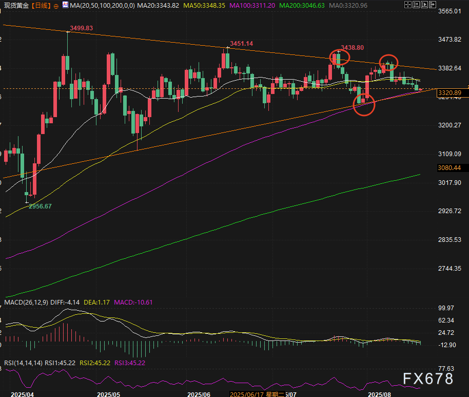 这些市场信号的高可靠性,使得黄金当前的图表位置极具观察价值——价格正逐步接近3311美元100日均线(MA)支撑位与5月低点以来上升趋势线的交点。截至目前,价格正在测试该支撑区域,尚未出现明确的看涨反转信号。鉴于动量指标已从看涨区间转入温和看跌状态,交易员需重点警惕下行突破风险。