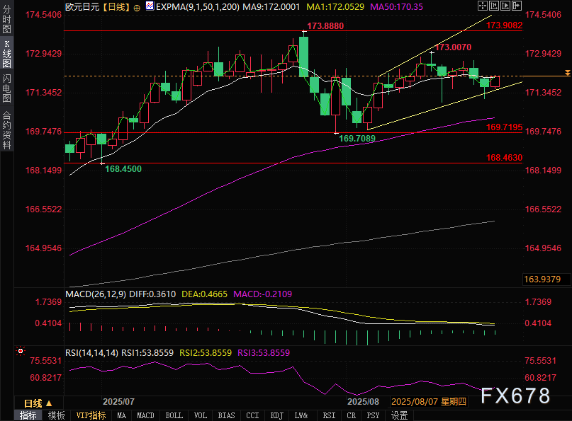 若有效跌破上升通道下轨,市场情绪可能转向看空,欧元兑日元或将承压下探50日指数移动平均线(170.35),继而考验7月31日创下的七周低点169.72。若继续下行,该货币对或进一步测试7月1日录得的两个月低点168.46。