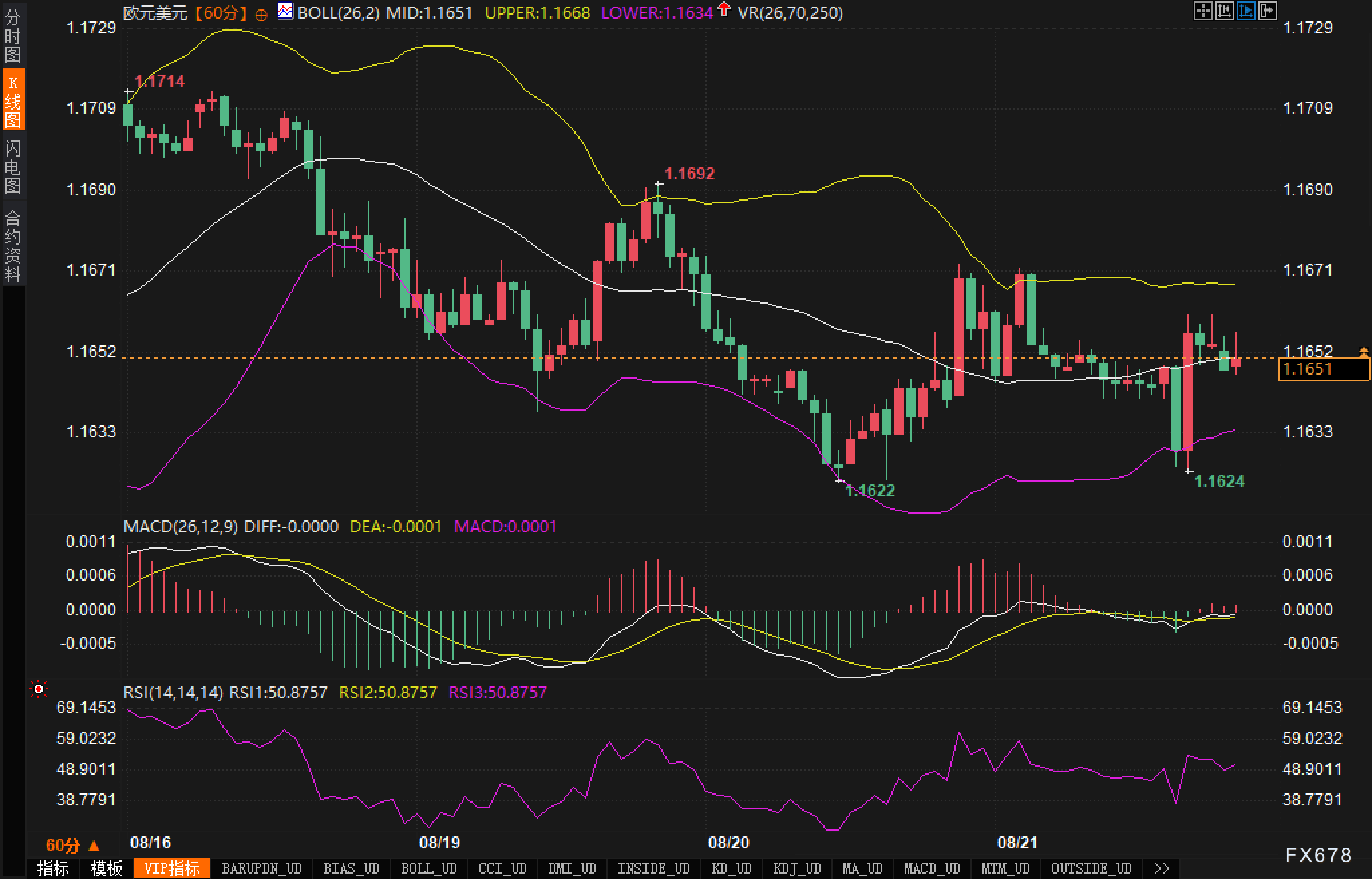 从60分钟K线图观察,欧元兑美元呈现明显的区间震荡格局。布林带显示上轨位于1.1668,中轨在1.1651,下轨处于1.1634水平,汇价目前运行在中轨附近,布林带收口迹象明显,预示短期内可能出现方向性突破。从价格形态看,汇价在1.1714形成阶段性高点后持续回落,经历1.1692次高点确认后加速下行,最低触及1.1622支撑位。后又回踩1.1624水平,形成短期双底形态,为多头提供技术性支撑。