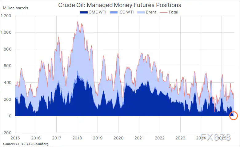 除上述基本面驱动因素外,管理型基金(通常也被称为“投机者”)在主要原油期货合约中的投机头寸同样值得关注。尤其是其近期在WTI原油上的头寸变化:纽约商品交易所(NYMEX)WTI原油的投机头寸上周跌至19年低点,若将洲际交易所(ICE)WTI原油头寸纳入统计,更是出现了历史上首次净空头头寸。这一局面为空头回补反弹创造了条件——尤其是在当前支撑位持续有效、库存下降趋势延续的情况下。这也解释了为何尽管市场不断讨论未来的供应过剩风险,但油价的下行突破空间仍受到限制。