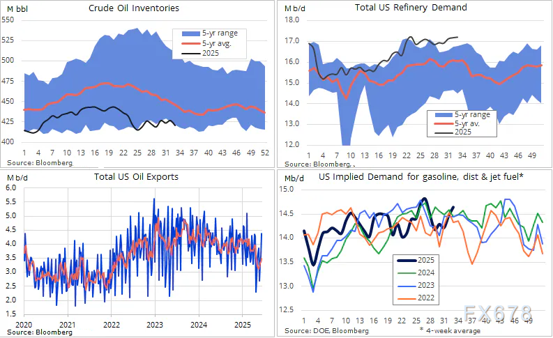 总体而言,原油市场正处于多空平衡状态:短期支撑来自强劲的炼油需求、出口增长及低迷的投机性持仓;中期压力则源于欧佩克+供应增长、需求预期放缓,地缘政治动态的影响同样不容忽视。目前布伦特原油锚定在65美元/桶左右,WTI原油在62美元/桶附近震荡,市场短期内似乎不愿推动价格向任一方向突破区间。