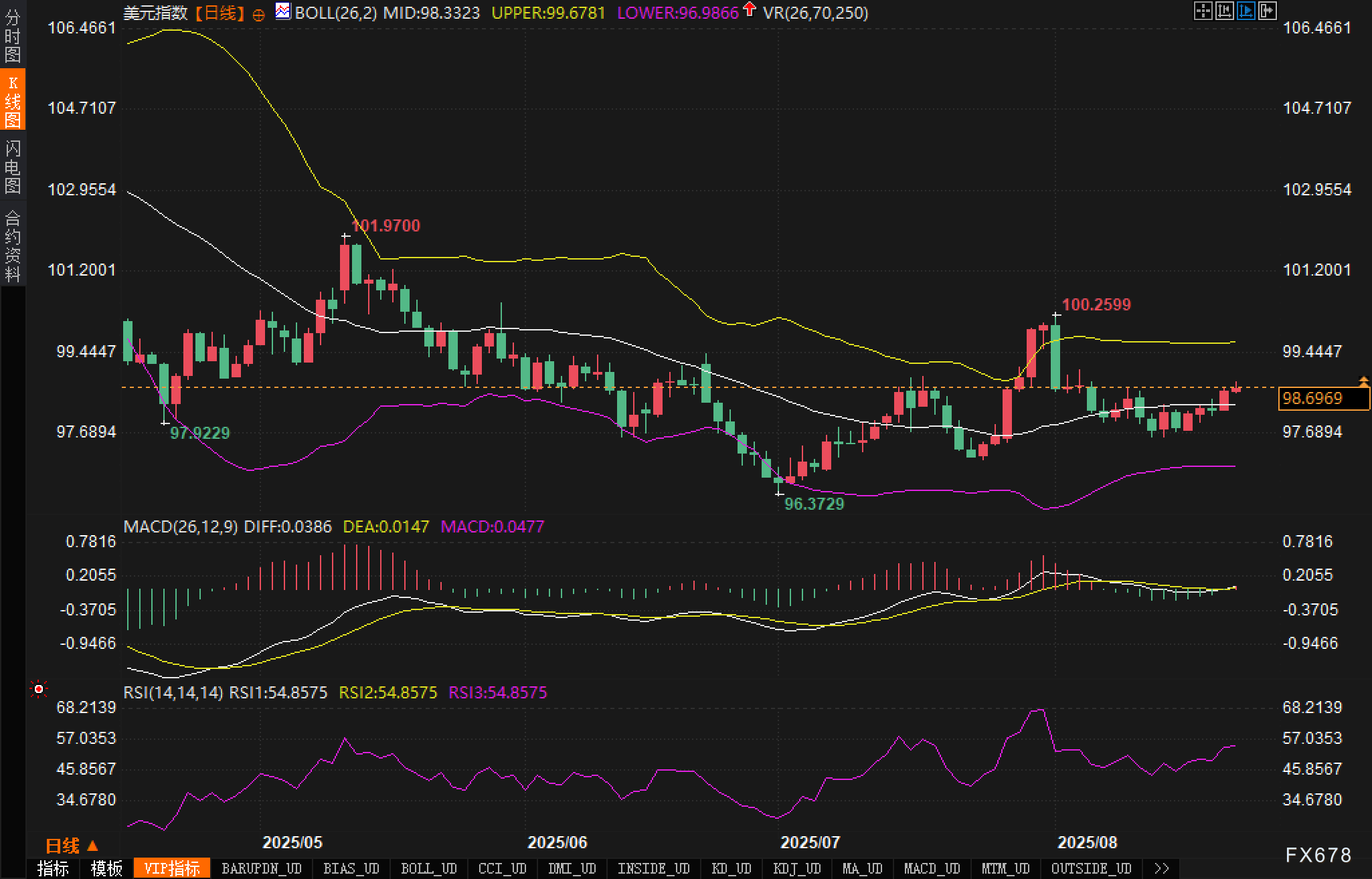 从技术面来看,美元指数的价格走势表现出一定的震荡反弹。图表显示,当前美元指数处于布林带中轨(98.3323)附近,且在短期内受到布林带下轨(96.9866)和上轨(99.6781)的支撑与压制。