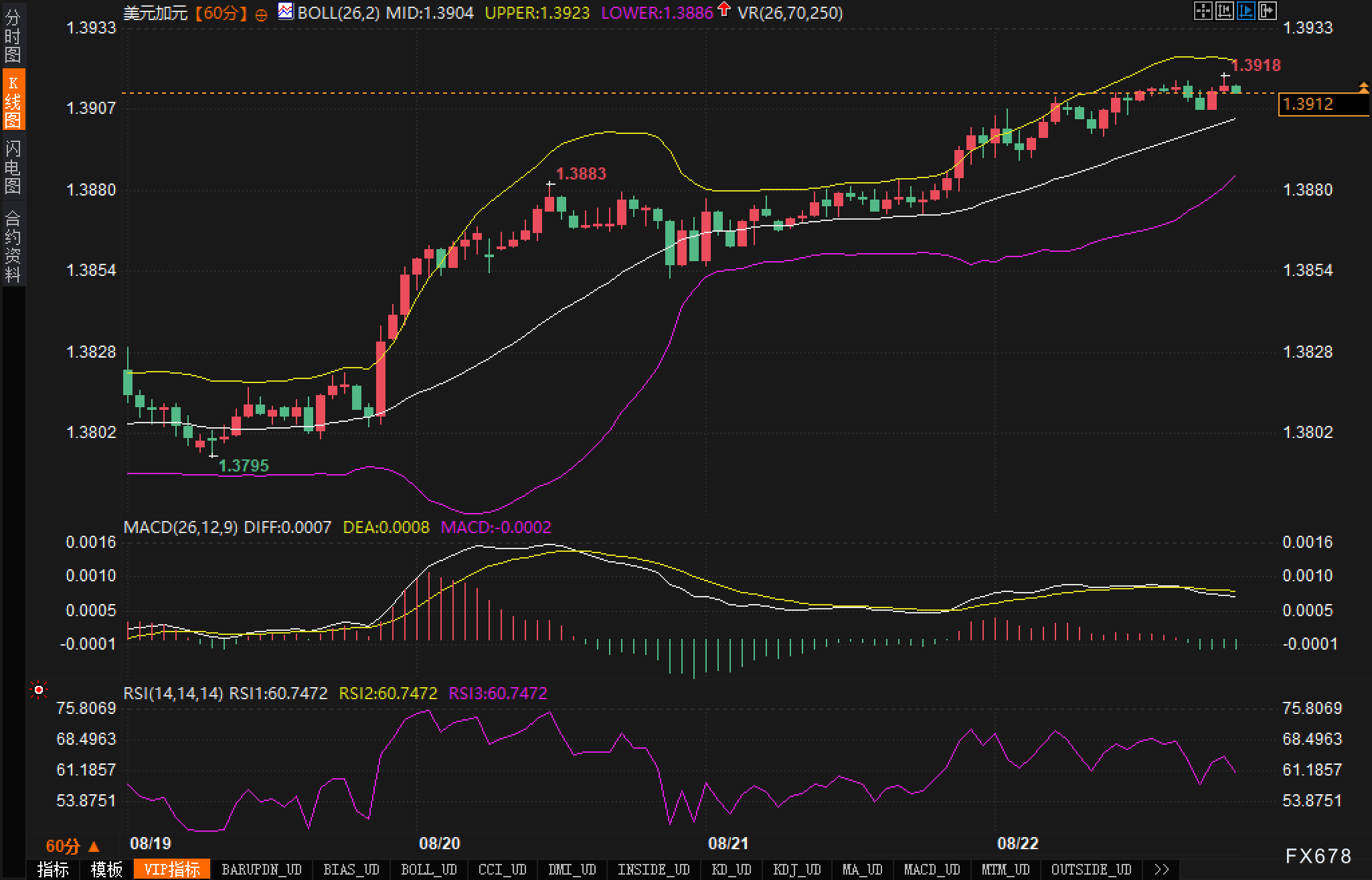 根据图表分析,美元/加元汇价目前处于上行趋势中。价格触及1.3918,为三个月来的新高,表现出强劲的上涨动力。