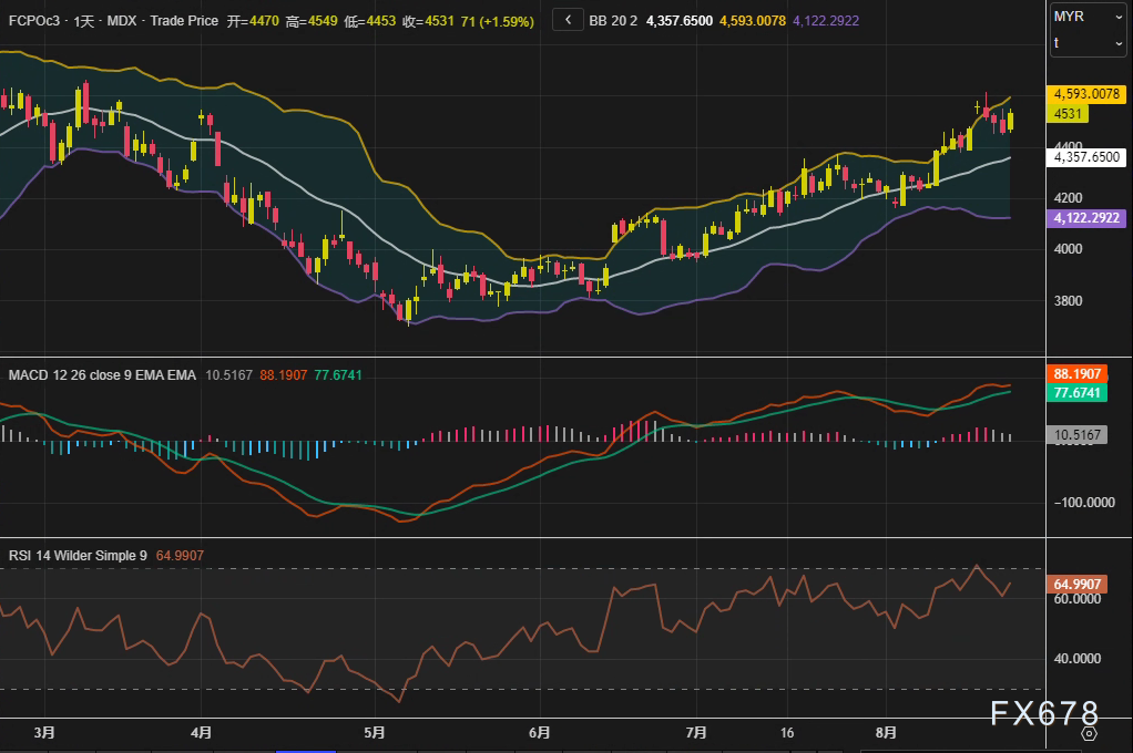 exness外汇官网——周五(8月22日),马来西亚衍生品交易所(BMD)棕榈油主力合约FCPOc3收报4531林吉特/吨,单日涨幅1.59%,周线累计上涨1.32%,实现连续第三周收阳。盘中价格波动区间贴合技术分析预期,日内突破布林带中轨(4357林吉特)后向上轨(4593林吉特)试探,RSI指标位于64.99,显示市场情绪偏强但未进入超买区间。