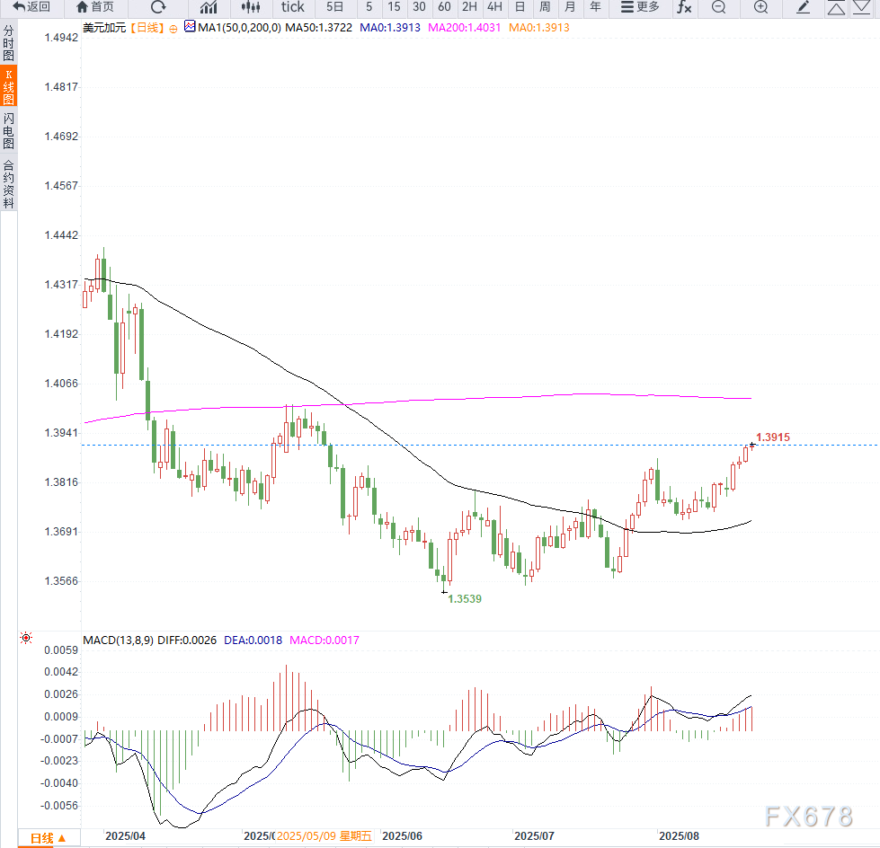 当前USD/CAD的上涨更多是由美元的阶段性强势推动,而非加元的系统性弱势。随着美联储9月会议临近,若美联储降息幅度低于市场预期,美元可能进一步走强并推动汇价突破1.4000。