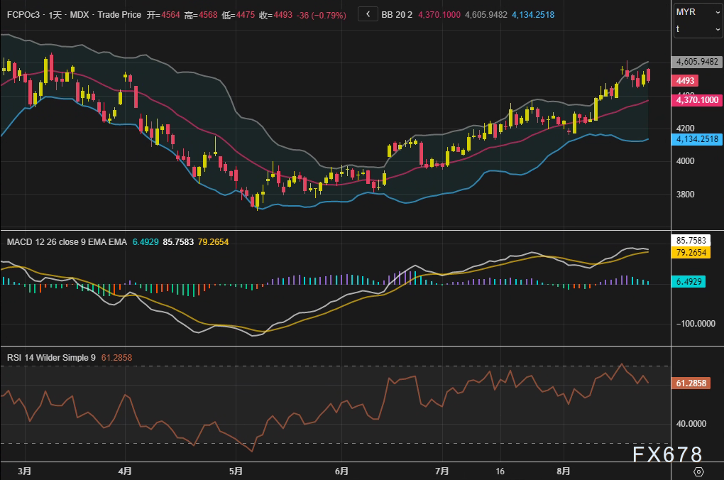 exness外汇官网——周一(8月25日),马来西亚衍生品交易所(Bursa Malaysia Derivatives Exchange)棕榈油主力合约FCPOc3收报4493林吉特/吨,日内下跌36林吉特,跌幅0.79%。尽管前一交易日曾录得1.55%的涨幅,但市场在高位显现疲态,投资者对价格抑制需求的担忧逐渐升温。
