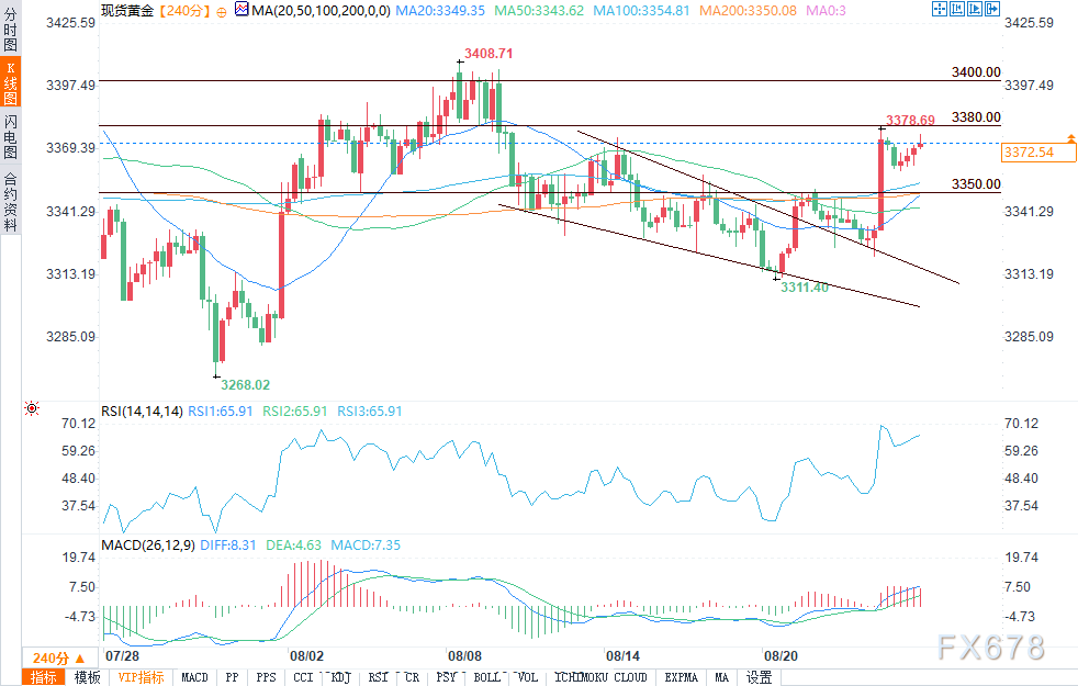 exness外汇官网——周一(8月25日)美盘时段,黄金在上周五触及两周高点后,本周开局走势略显疲软。此前,美联储主席鲍威尔在杰克逊霍尔经济研讨会发表鸽派言论,推动贵金属板块普遍上涨。黄金价格正收复早盘失地并小幅走高,在3373美元左右的近期高点附近盘整。
