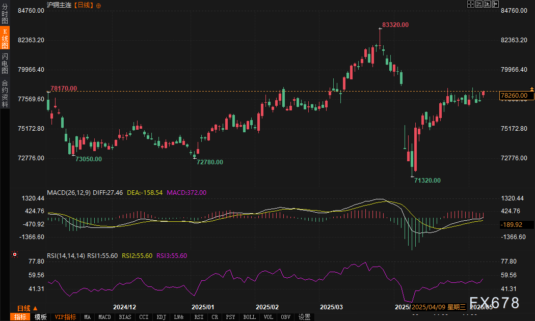 从技术指标看,LME期铜与沪铜均显示出短期企稳信号。LME期铜的RSI 14为55.41,处于中性区域,MACD指标显示DIFF为-16.56,DEA为-51.43,MACD值为69.75,表明短期动能有所修复,但仍未完全扭转此前下行趋势。沪铜方面,RSI 14为55.60,同样处于中性,MACD指标的DIFF为27.46,DEA为-158.54,MACD值为372.00,显示出较强的反弹动能。尽管技术面未出现明确的多空转向信号,但当前指标反映市场在消化前期跌势后,正尝试寻找新的平衡点。