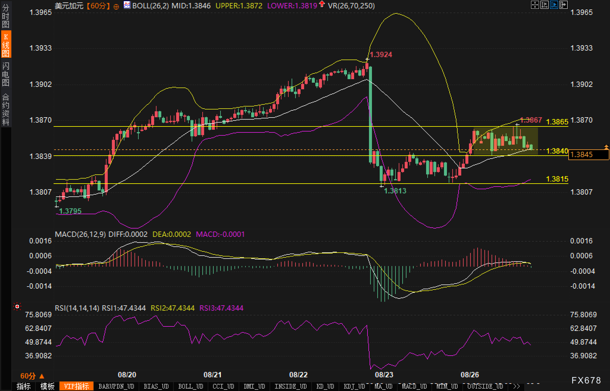 小时图显示,布林带呈轻度收口,布林中轨在1.3846附近,上轨位于1.3872,下轨在1.3819,带宽收窄对应波动率下行。价格结构上,前期自1.3924形成“单根长阴+跳水”后的V形反抽未能延续,1.3870—1.3865区域构成密集阻力;下方1.3840为横向枢轴位,1.3815与1.3813形成短线叠加支撑。若上破1.3870并伴随布林带扩张与量能放大,则可视为“量能突破”,上方空间或再指向1.3900及1.3924;若跌破1.3840并有效收于中轨下方,则大概率回测1.3819/1.3815,失守则指向1.3795与前低带。
