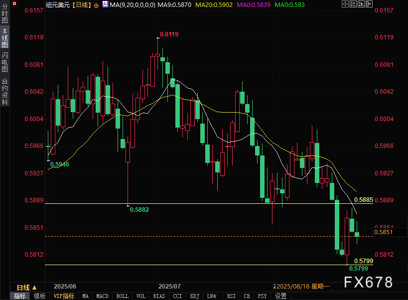 exness外汇官网——纽元兑美元正在回吐此前涨幅,从周一(8月25日)0.5880高位回落后,重返0.5800区间低位,交投于0.5840附近。由于特朗普试图罢免美联储理事库克,市场避险情绪升温,令风险敏感型货币纽元承压。