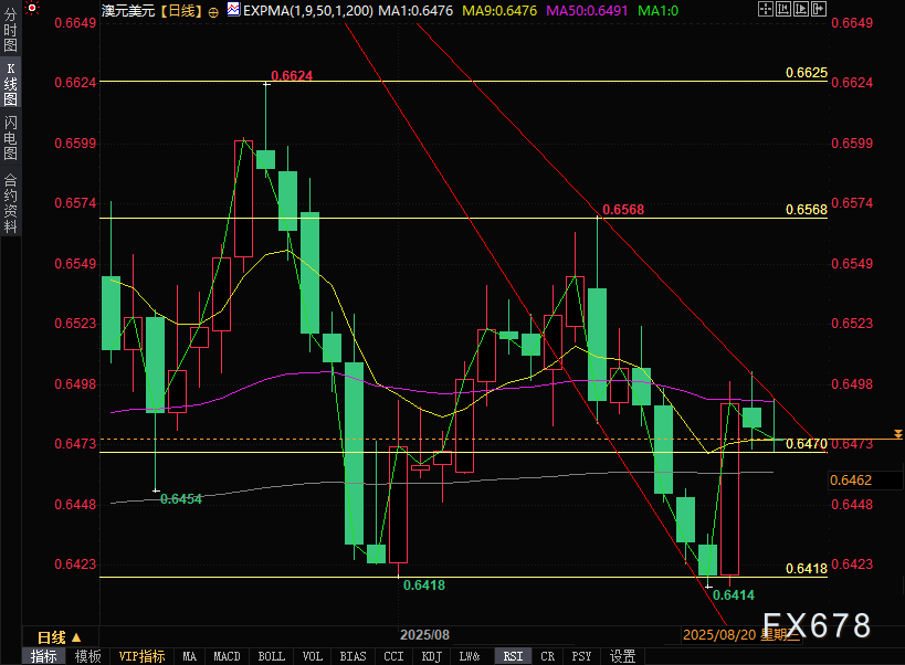 上行方面,澳元兑美元正在测试0.6590附近(下降通道上轨与50日指数移动平均线0.6491交汇处)的即时阻力区域。若成功突破该关键阻力带,将确认看涨趋势转换,推动汇价上探8月14日创下的月内高点0.6568,继而挑战7月24日创下的九个月峰值0.6625。