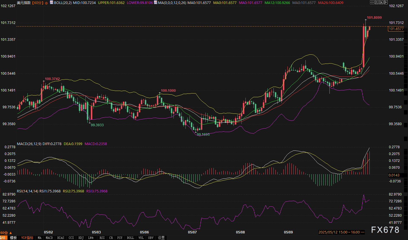 exness——周一(5月12日),受中美贸易会谈联合声明推动,美元指数在亚洲时段迅速拉升,日内涨幅达1.20,报价攀升至101.6251,创下近三个月新高。这一突破性行情不仅反映市场对贸易摩擦缓和的积极定价,更揭示了技术面与基本面的共振效应。以下从多周期视角解析当前市场动能及未来潜在路径。