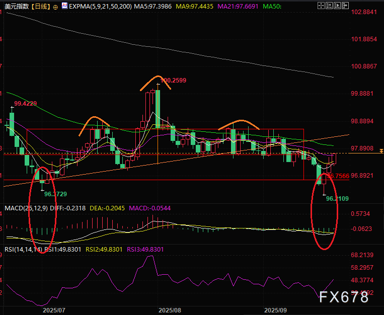美元在光速触及96.21后展开反弹,可以看见底部出现了经典的MACD背离,支持美元指数迅速展开反弹。