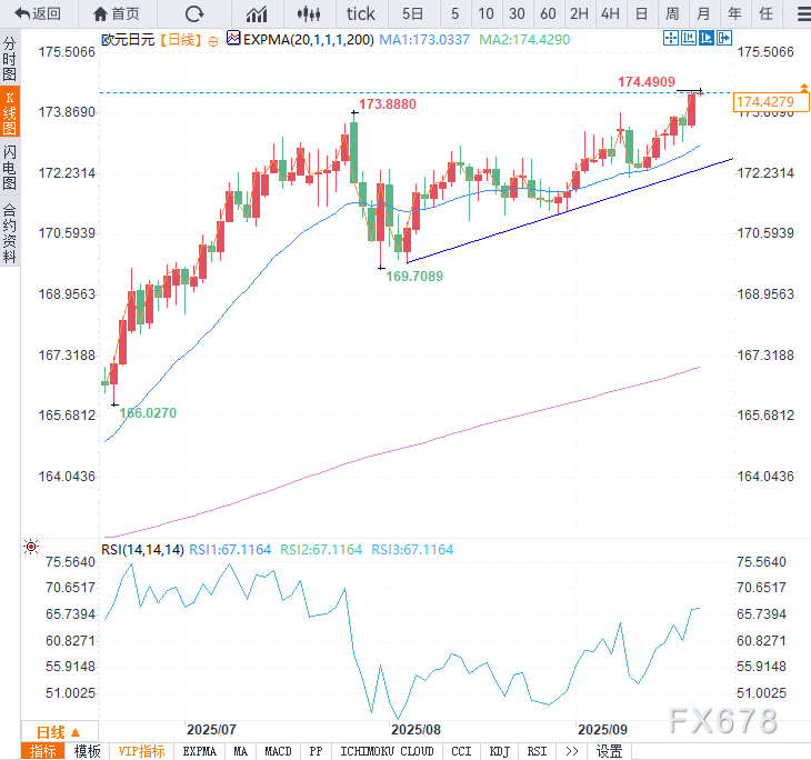 欧元兑日元强势突破,目前已升至2025年7月以来的最高水平,现报174.44,这一看涨突破为重新测试2025年高点开辟了道路。