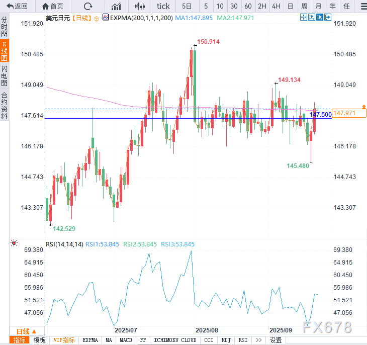美元兑日元的动能指标明确指向区间内上行,且日线收于200日指数移动均线(EMA,147.90)之上。一小时图表中可见明显的定向上涨趋势。