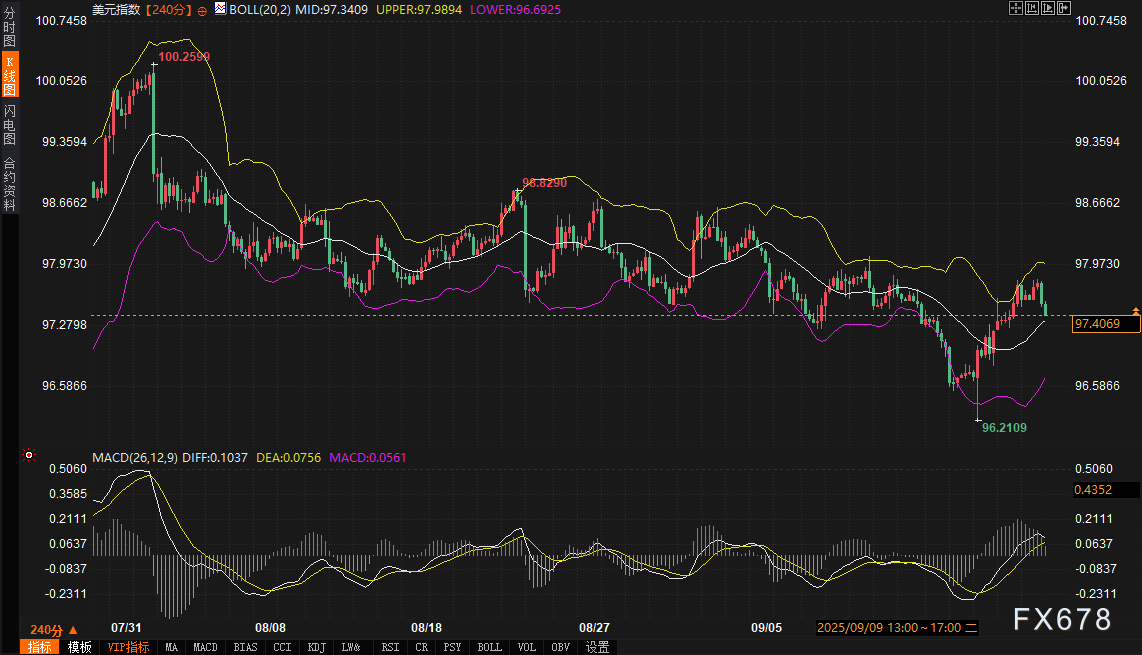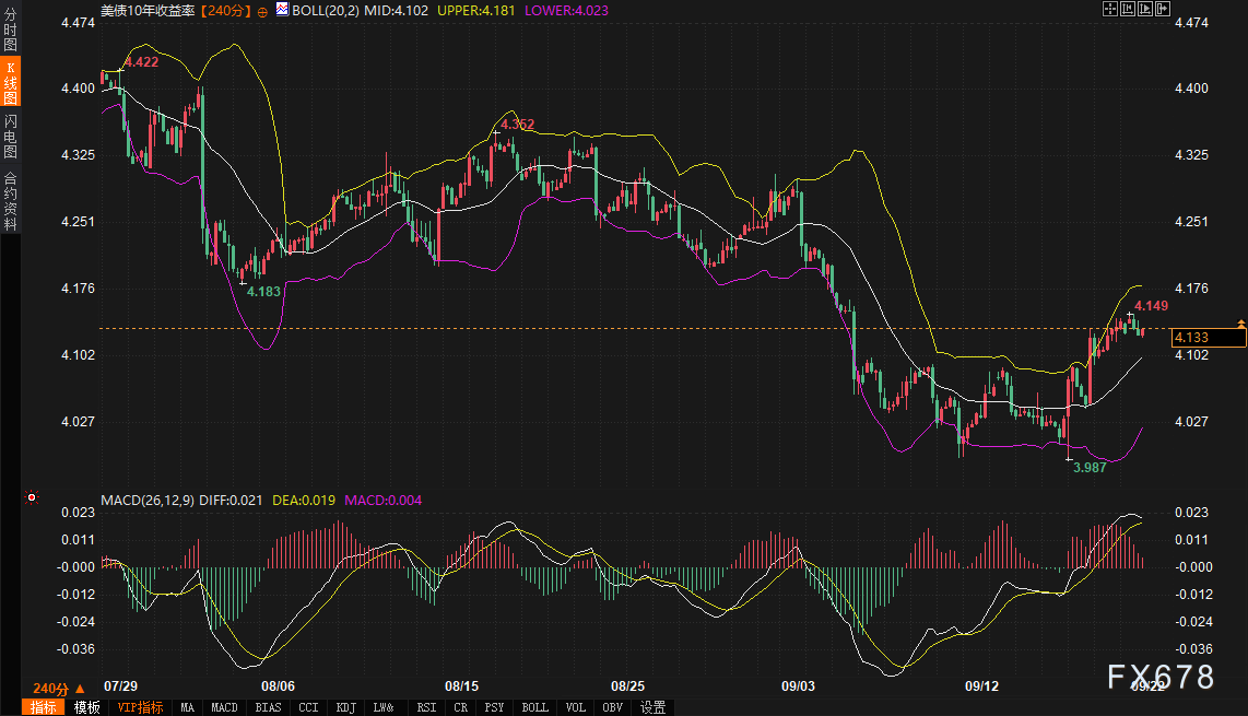 exness外汇官网——北京时间周一(9月22日),美元指数延续上周五的回落势头,显示出多头动能的初步疲软。同期,10年期美债收益率站上4.131,日内微升0.05%,在布林带中轨上方稳住阵脚,反映出市场对高利率延续的预期渐趋明朗。整体而言,美债收益率的企稳为美元提供了潜在支撑,但短期内美元指数仍受制于前期高点阻力,呈现出震荡回踩的迹象。