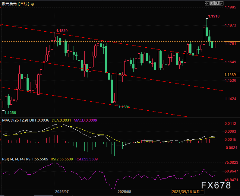 欧洲央行9月11日将关键再融资利率维持在2%(较去年水平腰斩),虽自6月以来始终维持利率不变,但市场普遍预期其将在今年年底前再降一次息。这一预期直接压制欧元走势,周一欧元兑美元一度续跌至1.1730。由于欧元在美元指数权重中占比超50%,欧元走弱成为近期美元指数攀升的核心动力之一。