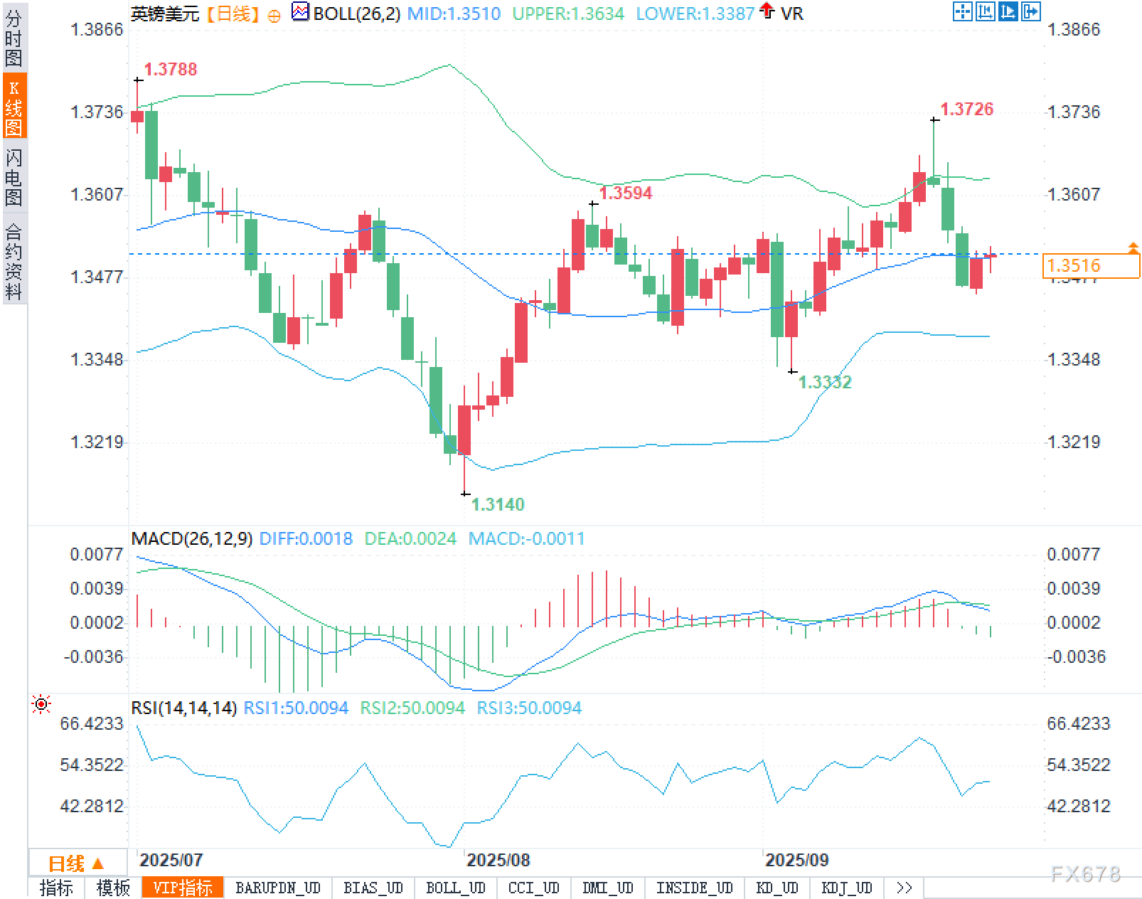 从日线图看,英镑兑美元正贴近布林带(26,2)中轨运行,布林中轨约1.3510,与现价1.3516几乎重合,技术上构成“均值磁力位”。上轨与下轨基本水平且带宽温和,暗示近期属于盘整市场,波动率处于中性偏收缩阶段。价格自低点1.3140启动的反弹在9月上旬并未形成持续趋势,期间在1.3594附近遇阻,随后冲高至1.3726后回落,前高1.3788未被改写,形态上呈现“高位逐步下移”的轻度下降楔形/箱体上沿压制特征。