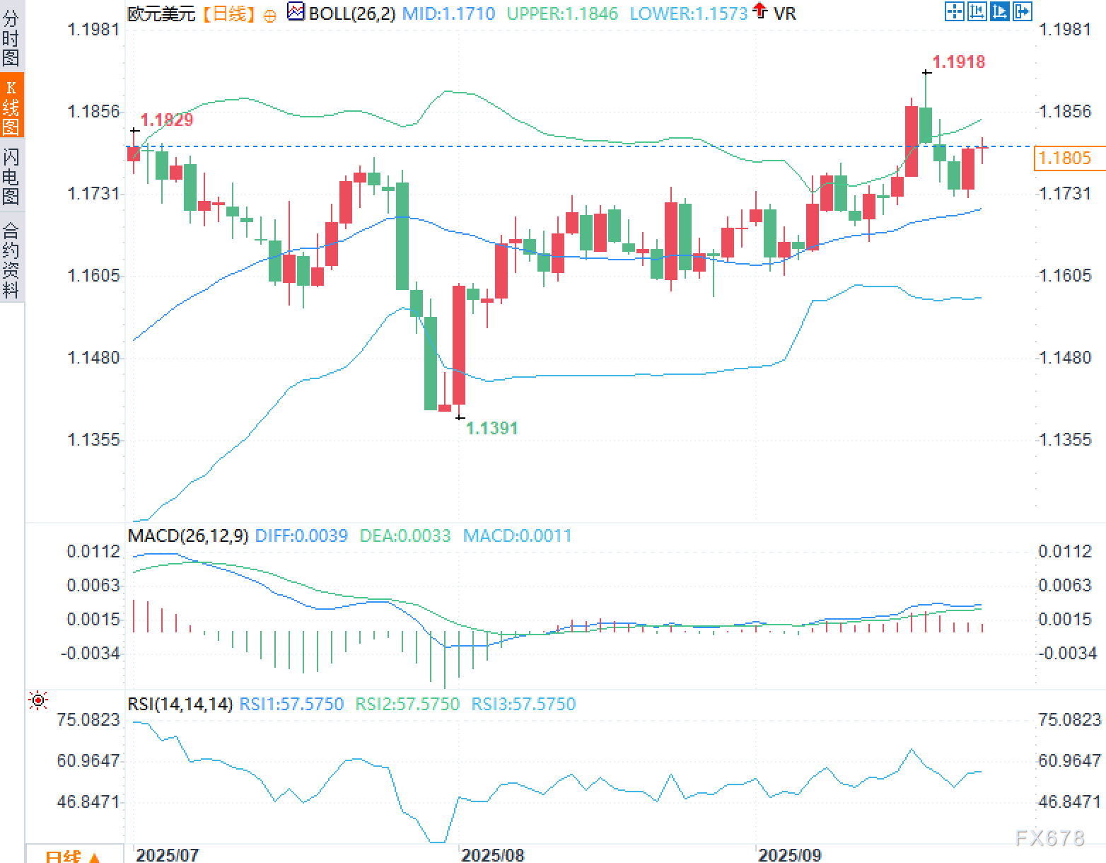 1)布林带轻度张口,上轨1.1846 / 中轨1.1710 / 下轨1.1573。汇价自1.1391低点反弹后,于9月冲高至1.1918,随后回撤并在中轨上方重启上行,目前1.1805,距离上轨尚有约40点空间,上轨对短线构成第一阻力。