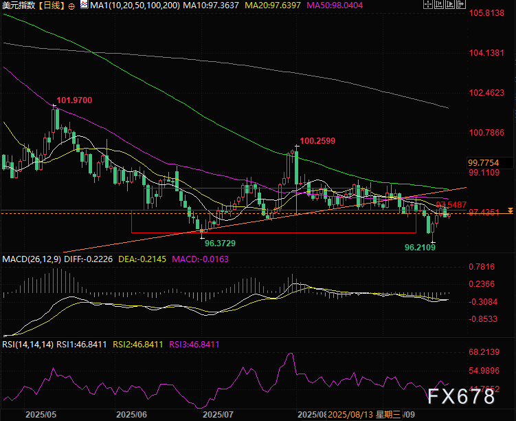 如之前文章分析过,技术面上美元指数受到均线和箱体上沿97.50的压制,MACD,RSI指标均显示依然是空方主导,美元指数如果想从反弹走势变成上涨行情,需要涨至98.50附近,突破上箱体和头肩顶的颈线。