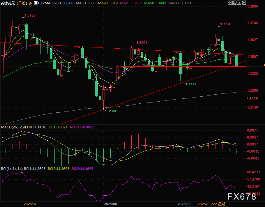 周三,受9月英国商业活动增速放缓拖累,英镑(GBP)对其他主要货币维持弱势震荡。标普全球综合采购经理人指数(PMI)初值录得51.0,低于市场预期的52.7,亦低于8月的53.5,表明英国整体商业活动虽仍处于扩张区间,但增速已显著放缓。