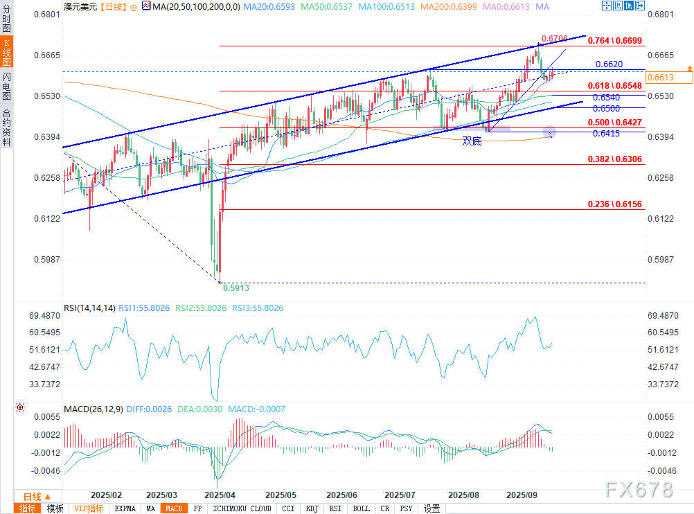 下行方面,只有当汇价跌破50日平均线(50-SMA)所在的0.6540位置时,才可能引发一波激进抛售,进而下探7-8月形成的双底形态低点0.6415。值得注意的是,此前长期下跌趋势的50%斐波那契回撤位与200日平均线(200-SMA)也处于该区间附近。