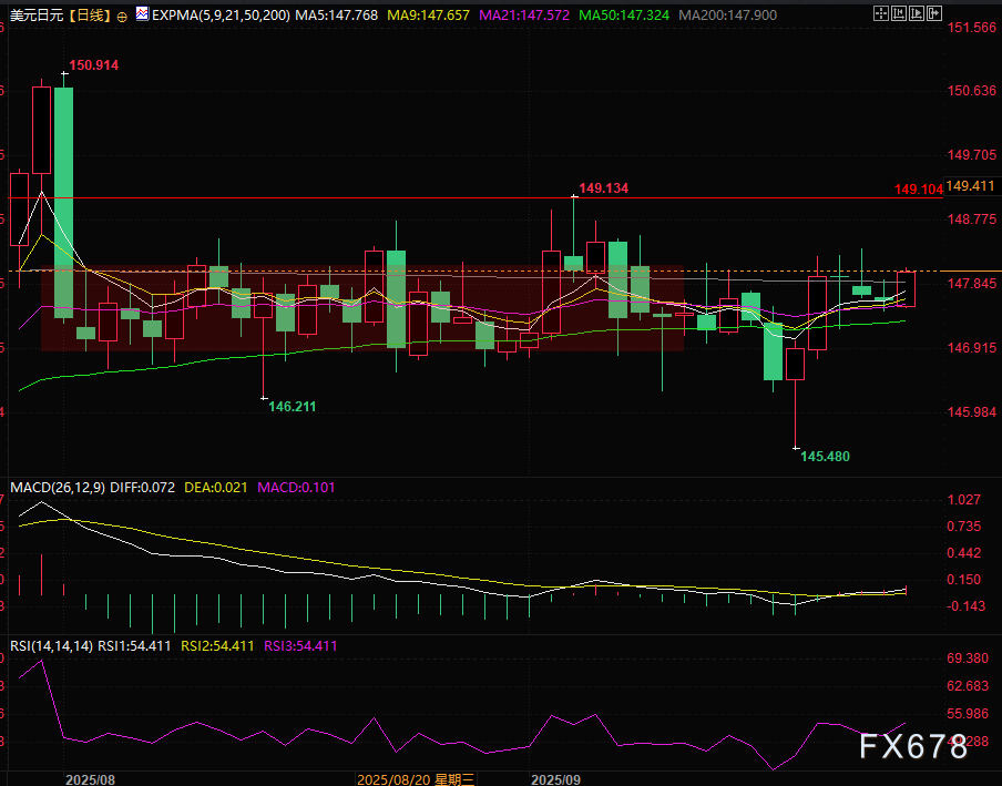 因此,后续任何上行走势均可能首先面临148.00整数关口附近的即时压制位;站稳后,下一道阻力区间为148.35-148.40(即周一触及的两周高点),若能确认站稳200日SMA,美元兑日元汇率有望攀升至149.00关口,进而向月度高点(约149.15区域)推进。