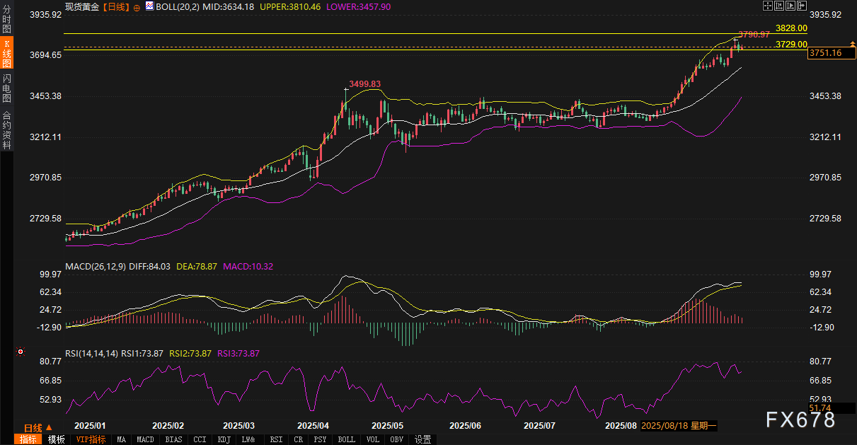 技术层面,黄金自8月中旬低点反弹近15%,日线RSI稳居75左右,进入超买区间。历史回测显示,此类拉升后回调概率逾80%,平均幅度8%-10%。MACD正向动能虽存,但已现减弱,布林带上轨扩张暗示调整窗口逼近。上行路径中,3800美元心理关口为首要目标,若借关门消息突破,下一站或指向3828美元的斐波那契扩展位。更远景下,3900美元趋势线呼之欲出。但RSI初现背离信号,短期动能或在3800美元前折戟。下行支撑首看3729美元盘中低点,若失守,3700美元前高将进入视线。更深调整指向3630美元,与布林带中轨,兼具技术与心理双重意义。
