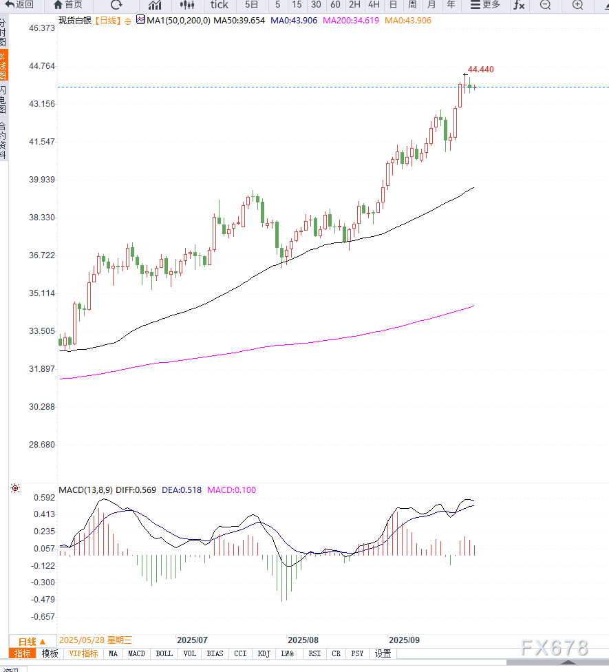 从日线图来看,银价在周二触及14年高点44.47美元后略有回落,但仍在上行趋势中运行。日线K线显示连续收阳,短期均线(5日、10日、20日)呈多头排列,支撑近期上涨势头。