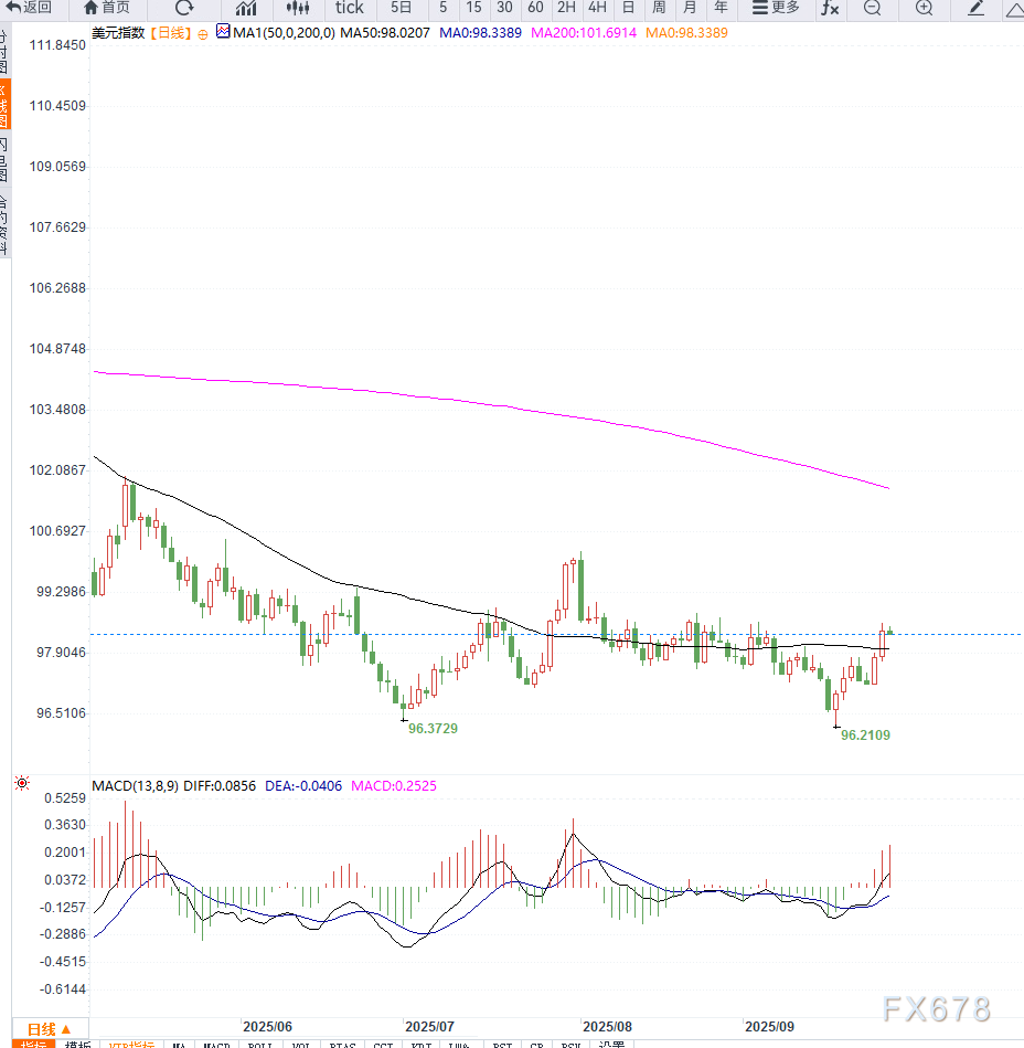 从日线图来看,美元指数在96.80附近获得支撑后连续反弹,目前站稳于98.40,逼近三周高点。短期均线呈现多头排列,MACD动能柱扩大,显示上行动能强劲。