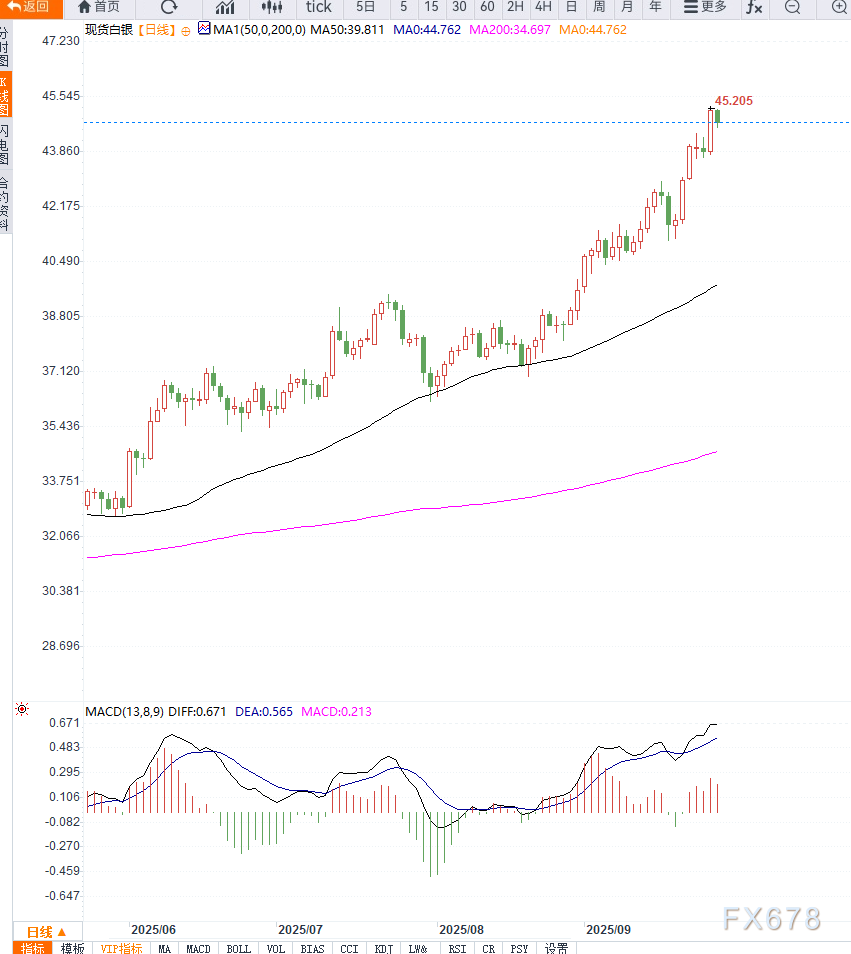 从日线图来看,银价在44.50—45.00美元区间面临较强阻力,短期出现冲高回落迹象。均线系统整体保持多头排列,但RSI指标已逼近超买区,显示上行动能或趋于放缓。