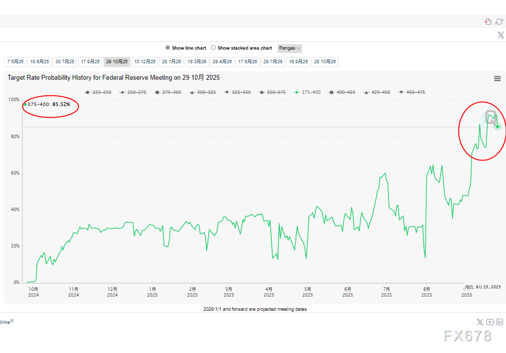 受到近期美国超预期的GDP和消费者支出影响,结合最近美联储主席鲍威尔的偏鹰派发声,美元指数近期快速上涨。美元指数的上涨也使CME的利率期货显示美联储10月降息概率概率一路下降。