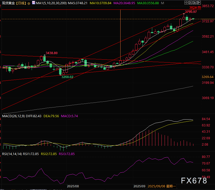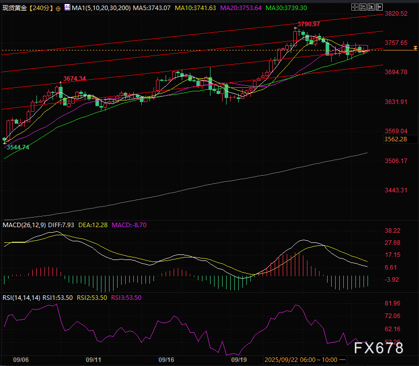 现货黄金多次触碰5日线,如果跌破大概率去3700的十日线和上升通道下轨处寻求支撑