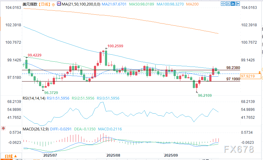exness外汇官网——周一(9月29日)美盘时段,美国美元指数(DXY)跌破50日均线,跌幅0.32%,收于97.774。交易员在评估逼近的政府停摆风险,同时也在关注一系列美国经济数据的发布。