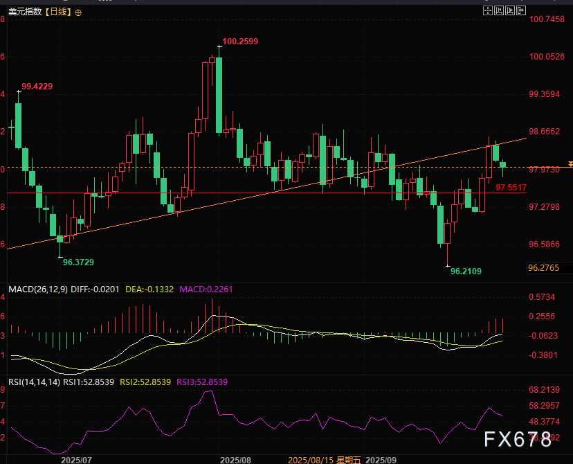 若下行行情兑现,跌破上述支撑区间后,由于两大支撑位之间缺乏有效中间缓冲,美元指数或将测试96.40支撑位。但倘若该支撑区间稳固守住则可以展望上行方向,多头则大概率瞄准98.60阻力位谋求有效突破——自8月初以来,美元指数始终未能攻克这一关键关口。一旦突破并站稳98.60上方,美元指数向100.25阻力位推进的概率将显著提升。