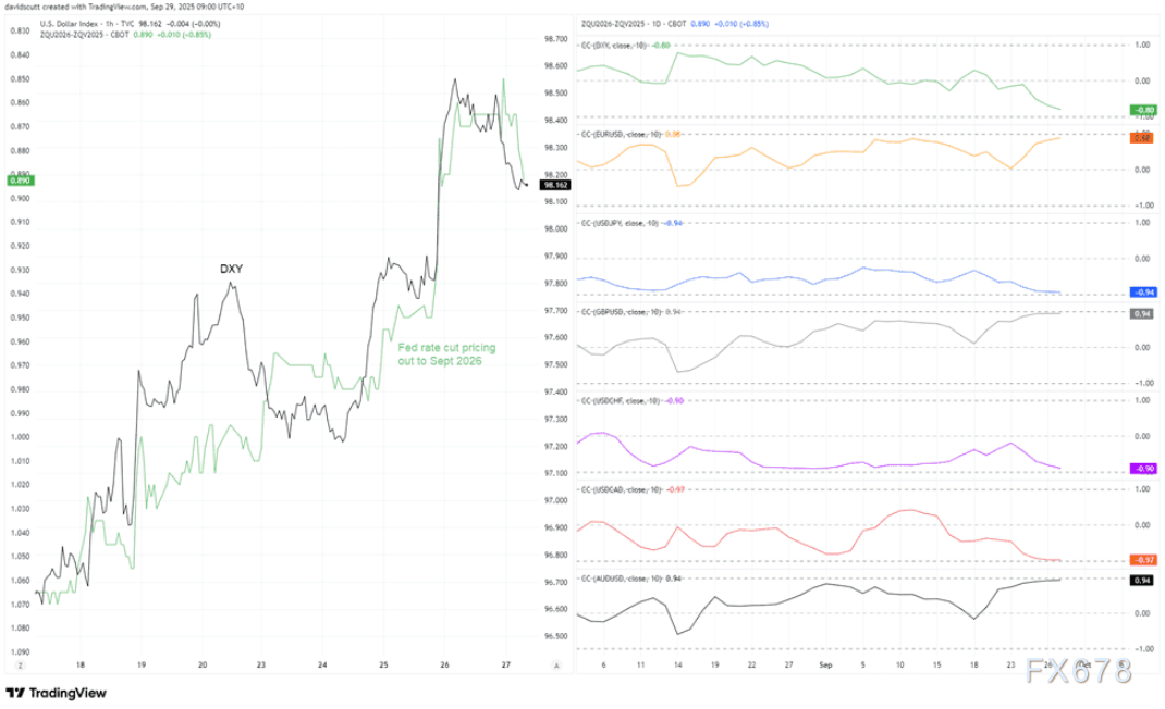 此类相关性数据具备高度显著性与参考价值,表明过去两周美元走势与降息定价几乎完全同步——降息定价升温时,美元承压走弱;降息定价回落时,美元快速反弹。