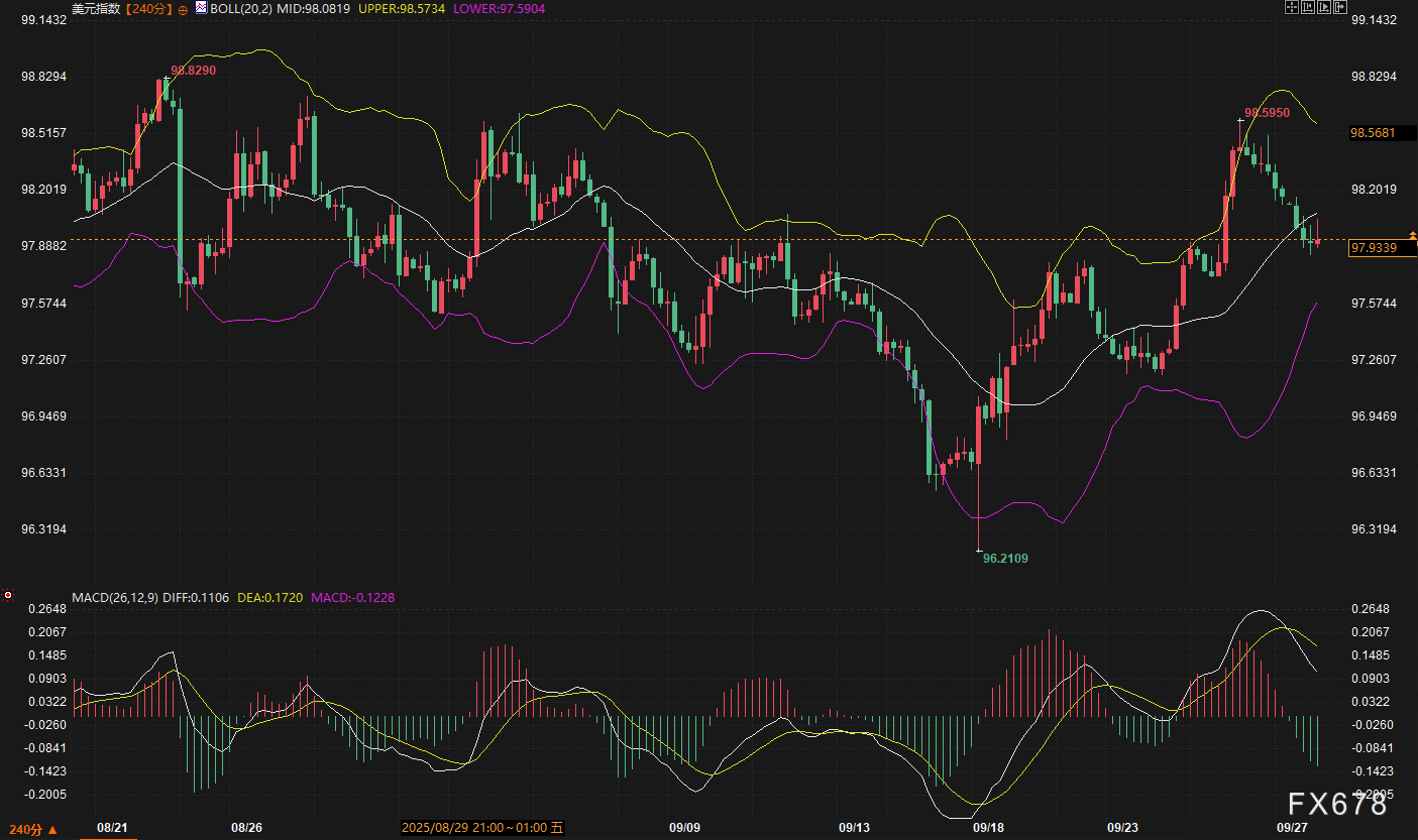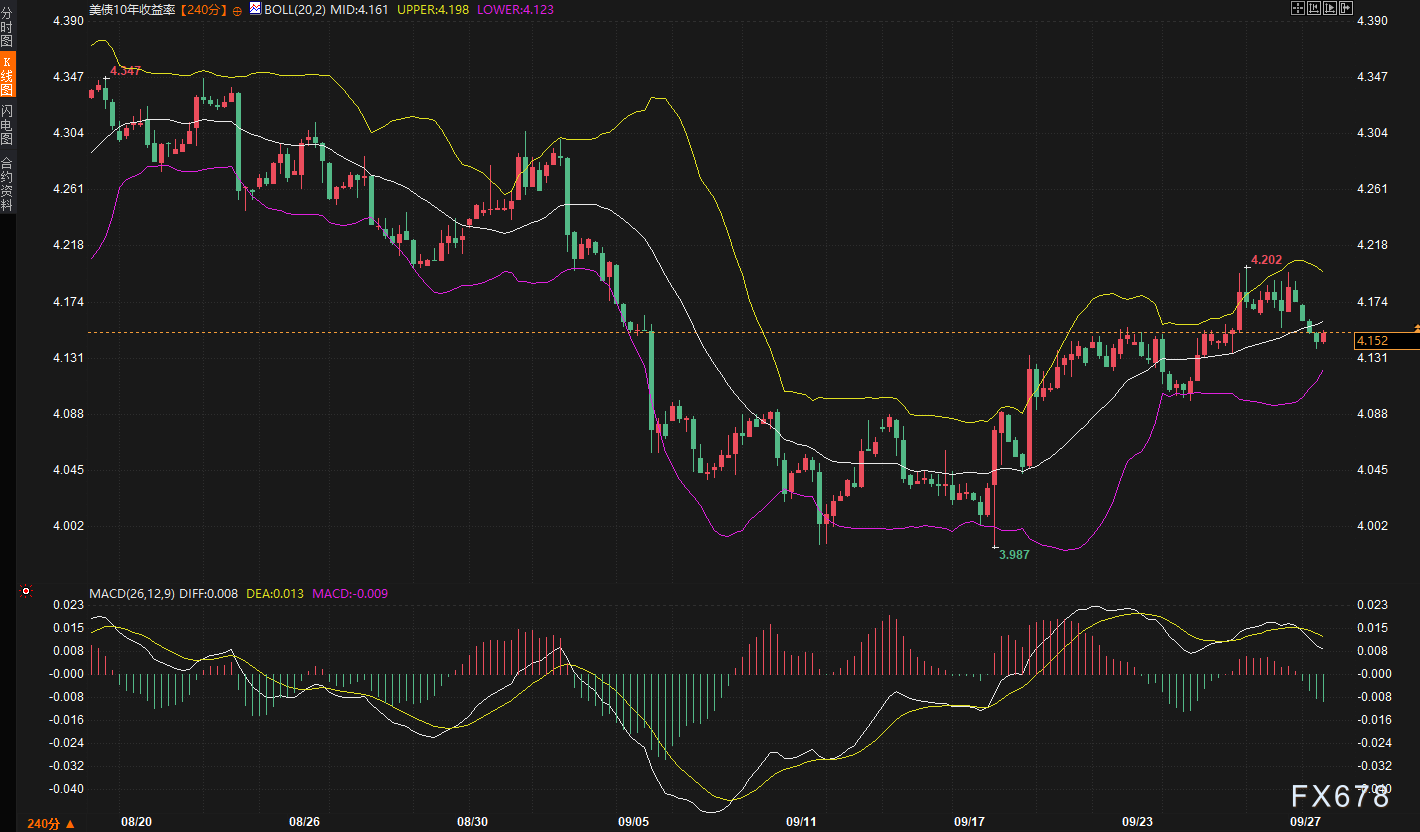 转向技术层面,美债收益率的240分钟图正处于一轮上行后的关键转折节点,当前4.152%的报价恰好回踩布林带中轨4.161%,多空拉锯一触即发。自9月中旬触底3.987%后,收益率曾同步美元指数的强势反弹,突破中轨并逼近上轨4.198%,创下4.202%的高点。但MACD指标已现死叉——DIFF线(0.008)下穿DEA线(0.013),柱状图转为负值(-0.009),这清晰昭示短期上行动能的消退。布林带开口收窄,暗示波动率可能趋缓,但中轨作为多空分水岭的地位不容小觑:若确认失守,下方4.12%-4.14%的支撑区间(布林下轨与前期平台重合)将面临考验,反之,若快速收复,则可能重燃对4.17%-4.20%阻力的试探。