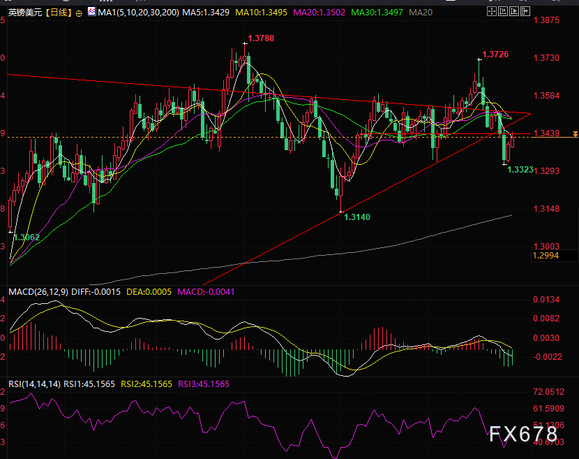 英镑兑美元运行于5、10、20、30日移动平均线下方,同时跌破了1.3439的关键价位和三角形整理形态,MACD和RSI均预示汇价将向空头发展,但是由于镑美今天反弹一度站上5日线以及1.3439关键位之上,英镑存在V型反转可能。1.3400是第一支撑位,同时如果未来汇价站上1.3439,英镑或许可以重升涨势。