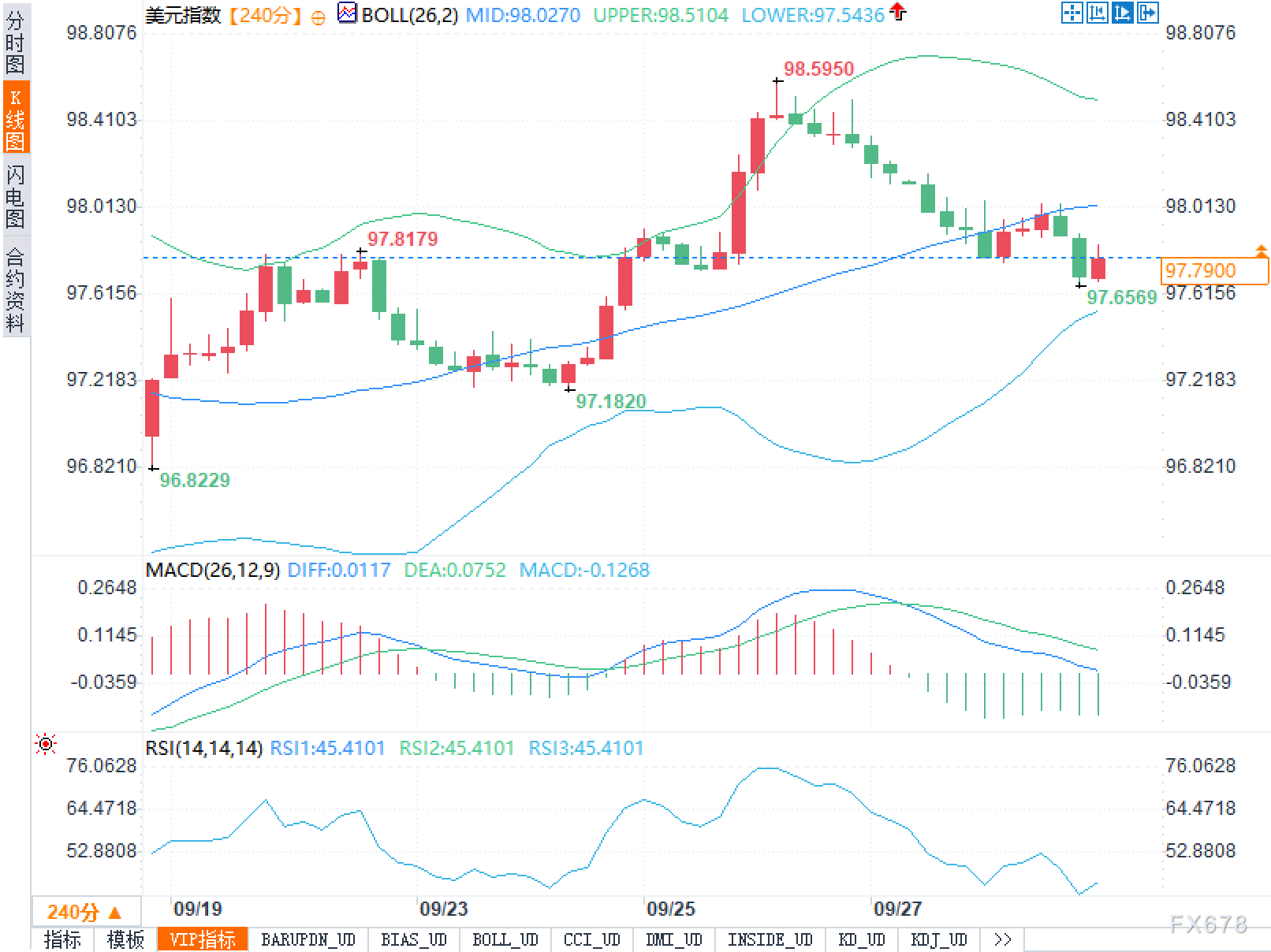 240分钟周期K线叠加布林带与MACD、RSI显示:价格自98.5950的阶段高点回落,当前运行在布林中轨之下、下轨之上;布林中轨98.0270、上轨98.5104、下轨97.5436,带形由扩张转为收敛,波动率阶段性降温。结构上,近期阴线实体偏多,反弹多为上影线较长的小阳,反映上方抛压仍在。MACD的DIFF为0.0117、DEA为0.0752,柱状图为-0.1268且持续为负,动能处于“零轴上方走弱—向零轴回归”的衰减阶段;RSI(14)为45.4101,位于50下方但未触及超卖,典型的弱势盘整。