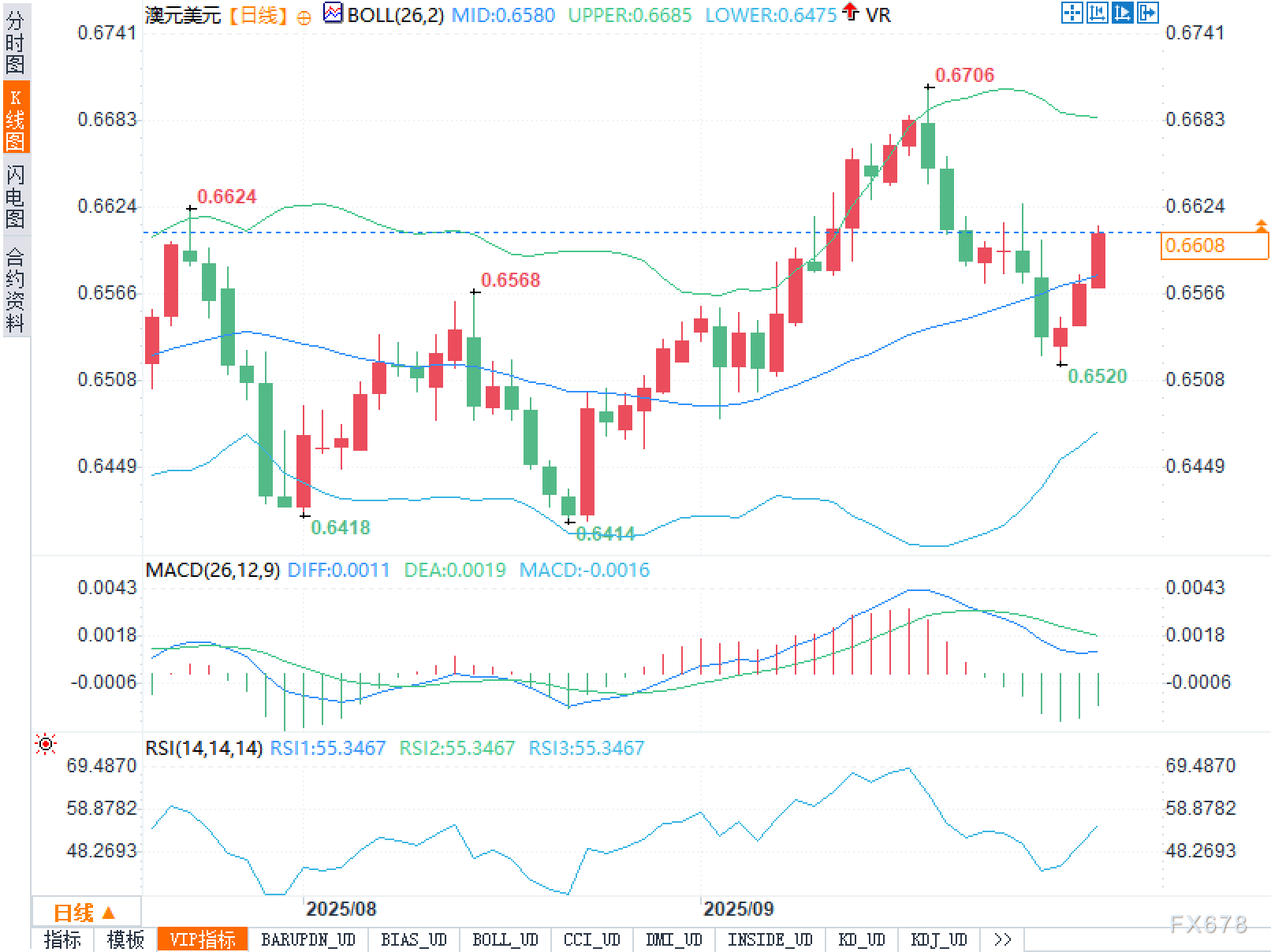价位结构上,近端支撑依次为0.6580(布林中轨)—0.6520(近期低点标注)—0.6475(下轨);阻力关注0.6624(前高标注)—0.6685(上轨)—0.6706(阶段高点)。只要0.6580不失守,上攻结构保持完整;若跌破,则回撤/回测中轨并寻求0.6520—0.6475的多重支撑共振。