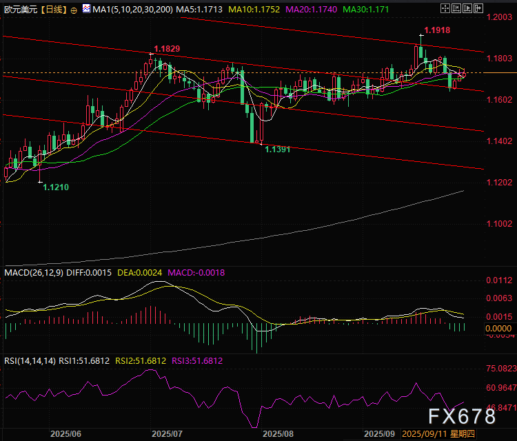 上行方向,周一欧元多头在周四高点(略低于1.1755)遭遇阻力回落。若能突破该点位,下一步将面临前期被跌破的趋势线转化而来的阻力位(当前位于1.1790),该点位大概率会形成较强压制。多头需站稳这些阻力位上方,才能打破当前短期看空格局,并将目光重新投向9月23日至24日的高点(1.1820附近)。