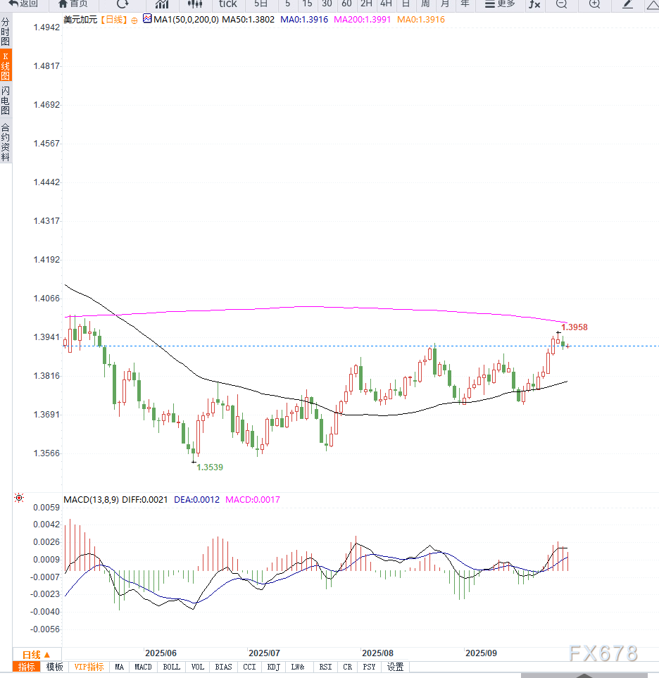 从日线级别来看,美元兑加元在1.3920附近维持横盘整理,整体趋势仍偏多。均线系统显示短期均线继续上行,对价格形成支撑;MACD指标在零轴上方运行,但红柱有所缩短,显示多头动能减弱。