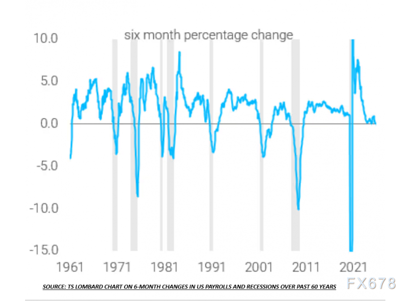 TS Lombard经济学家Dario Perkins最近特别介绍了一张他认为会“令美联储感到恐惧”的图表,该图表显示,美国不包括政府岗位和医疗保健岗位的所谓“核心”就业岗位,其六个月变动值接近于零。在过去60年里,每次经济衰退之前,这项指标都会出现负值。