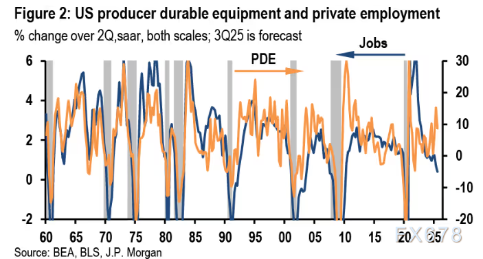 摩根大通经济学家最近强调,截至2025年上半年,资本支出年化增长率为11%,并指出即使劳动力需求似乎已经消失,这一增长在第三季度依然保持强劲。