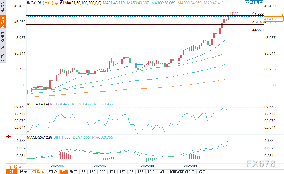 exness外汇官网——周三(10月1日),白银价格延续涨势,触及47.56美元的周内新高。当前美国政策风险上升、美元走弱且经济数据发布中断,交易员纷纷转向贵金属资产。白银目前有望向49.81美元的多年高点发起冲击,短期价格走势与政府停摆持续时间、美联储因数据缺失导致的政策制定能力受限密切相关。